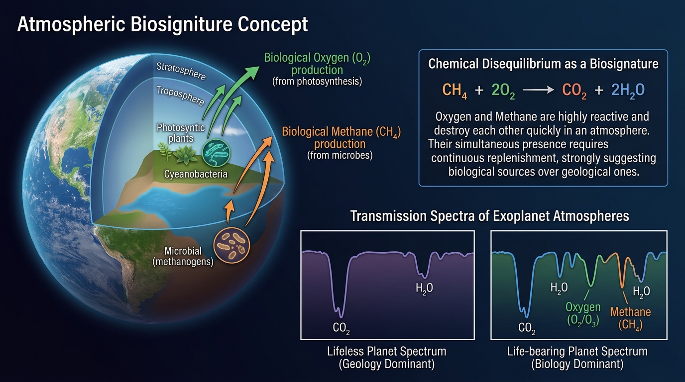 지구 대기는 산소와 메탄이 동시에 존재한다. 화학적으로 이 두 분자는 함께 있으면 반응해서 사라져야 한다. 그럼에도 지구 대기에 두 분자가 동시에 존재하는 것은 생명이 끊임없이 두 분자를 동시에 공급하고 있기 때문이다. 산소는 식물과 광합성 생물이, 메탄은 미생물이 공급한다. 이런 화학적 불균형 자체가 생명의 존재를 시사하는 신호다.