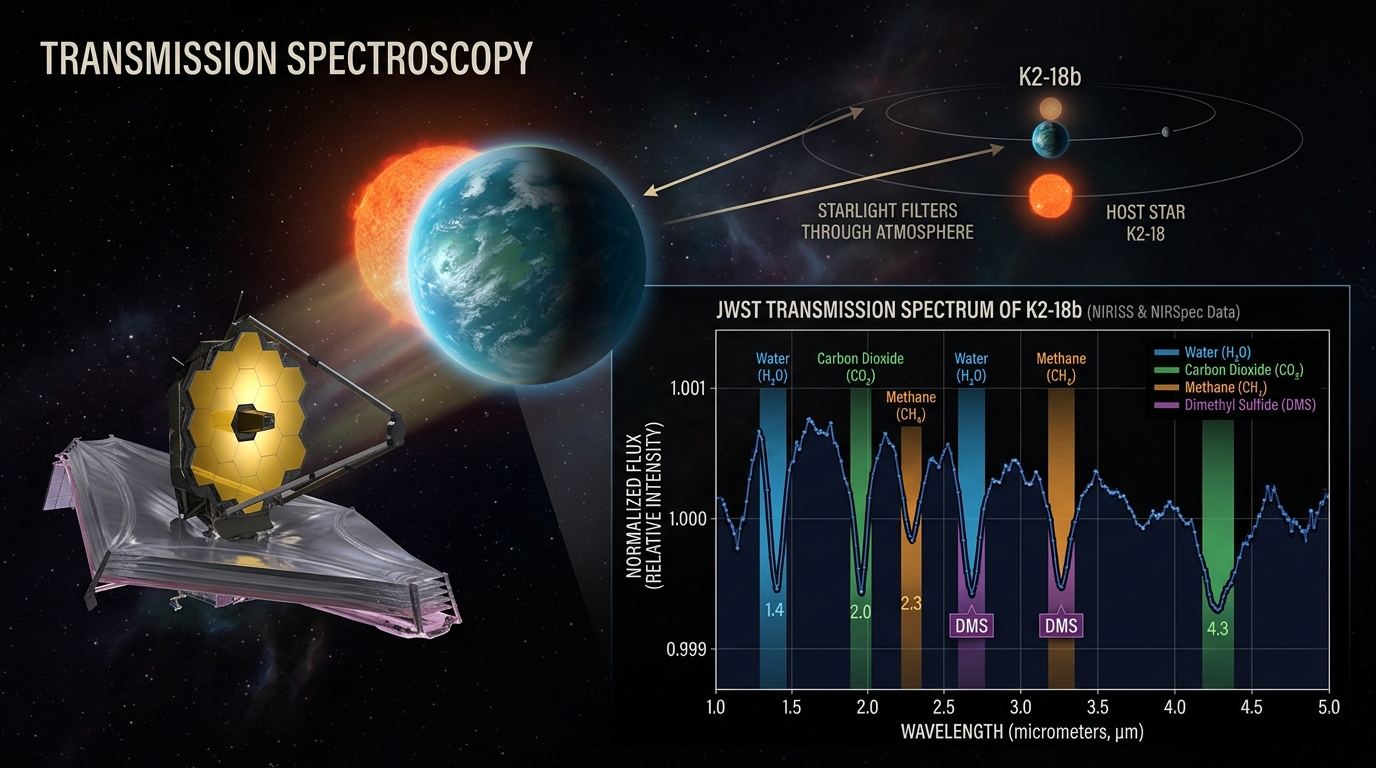 2023년 제임스 웹은 외계행성 K2-18b의 대기에서 탄소 기반 분자들을 확인했고, 디메틸 설파이드(DMS)가 있을 가능성을 제시했다. DMS는 지구에서 해양 플랑크톤이 생산하는 물질로, 생물학적 과정 없이는 대기 중에 상당한 농도로 존재하기 어렵다고 알려져 있다. 이 발견은 확정적 증거가 아니지만, 제임스 웹이 어떤 종류의 신호를 탐지할 수 있는지를 보여주는 사례로 주목받았다.