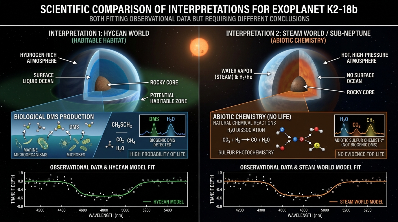 만약 K2-18b가 수증기가 주성분인 고온 고압 환경이라면, 표면이 생명이 살 수 있는 액체 바다가 아닐 수 있다. 이 경우 DMS가 있다 해도 그것이 생명에서 비롯됐다는 해석은 성립하지 않는다.
