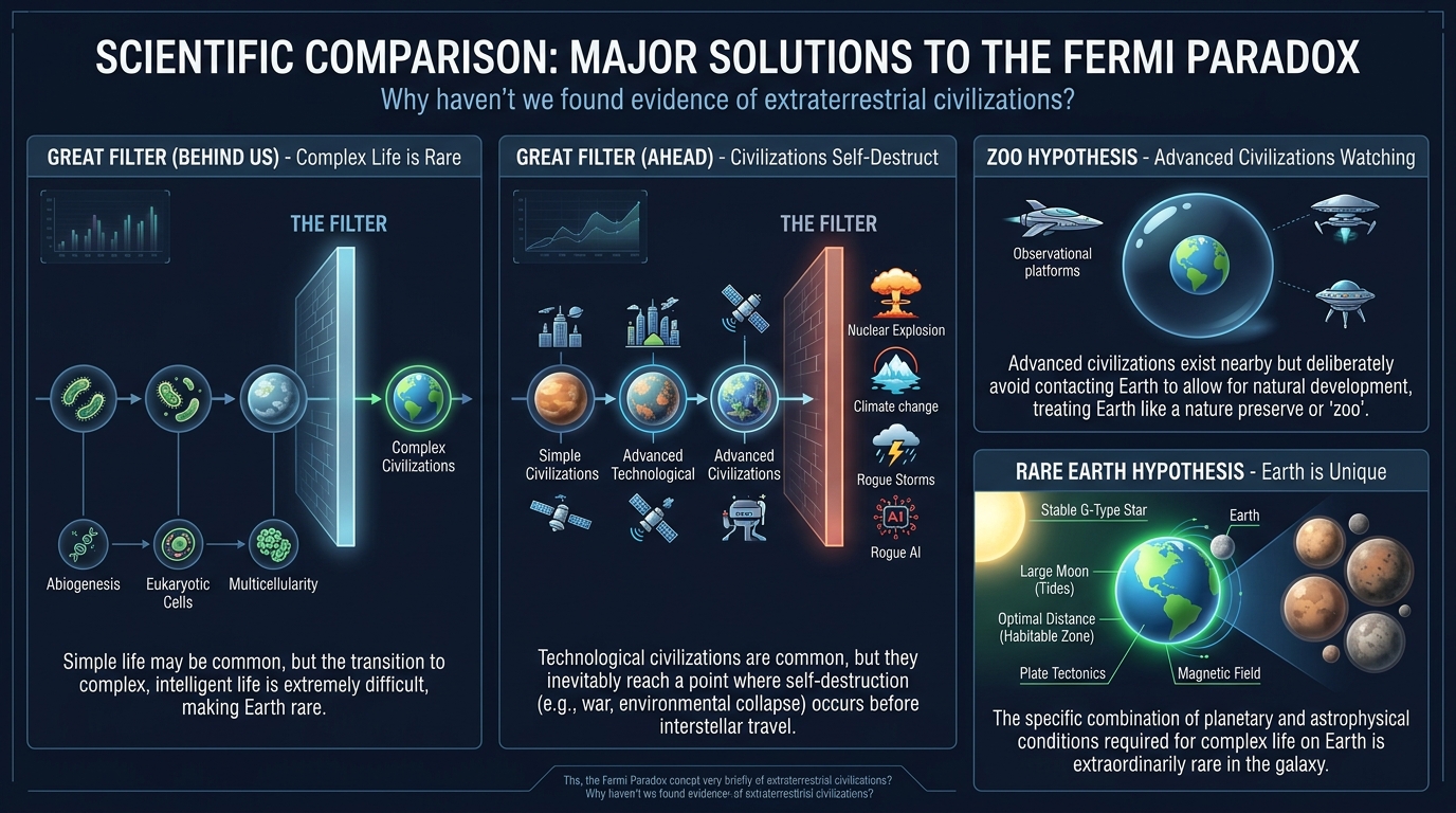 위대한 여과기 외에도 페르미 역설에 대한 다양한 가설이 있다.