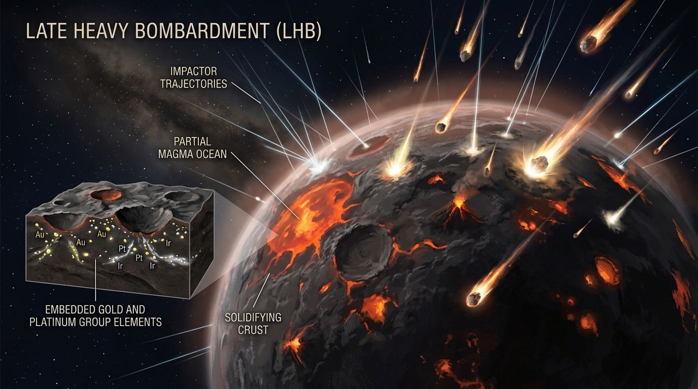 첫 번째는 늦은 충돌기다. 지구가 핵과 지각으로 분화된 이후, 약 38억~41억 년 전에 소행성 폭격기가 있었다. 이때 대량의 소행성과 운석이 지구에 충돌했는데, 이 천체들이 가져온 금과 백금족 원소들이 이미 굳어 있던 지각에 쌓였다. 이 금은 더 이상 핵으로 내려갈 수 없었다.